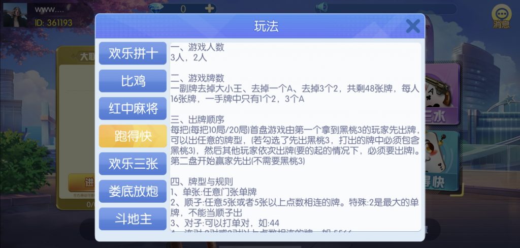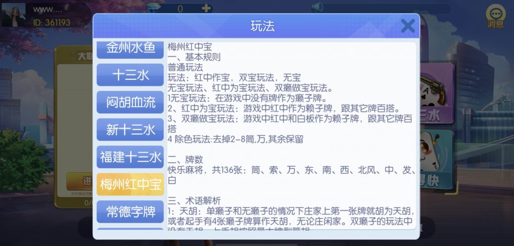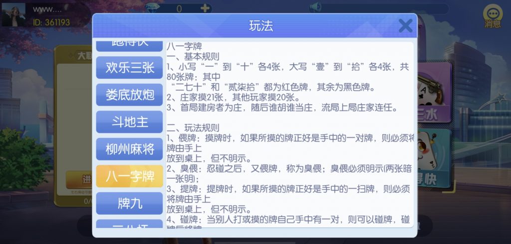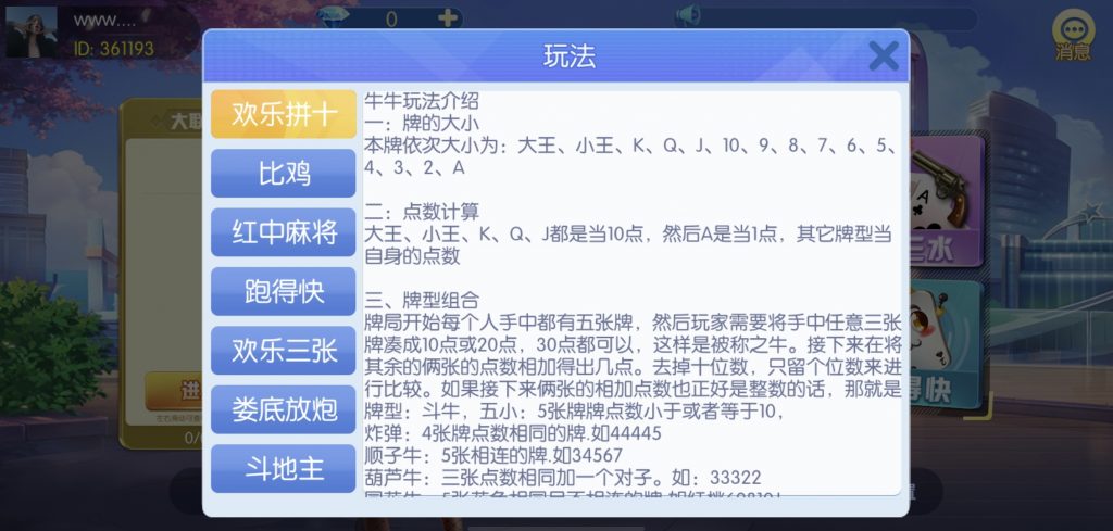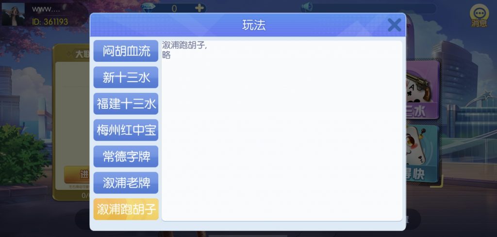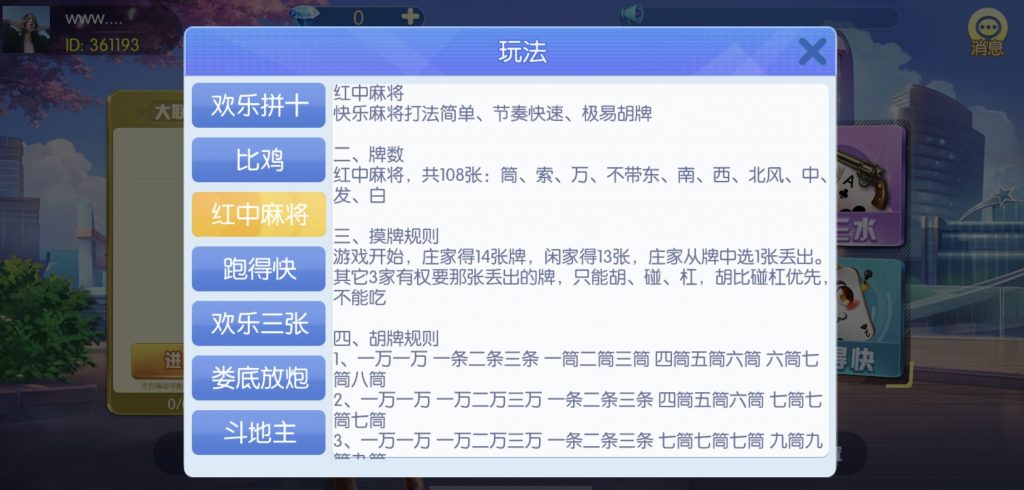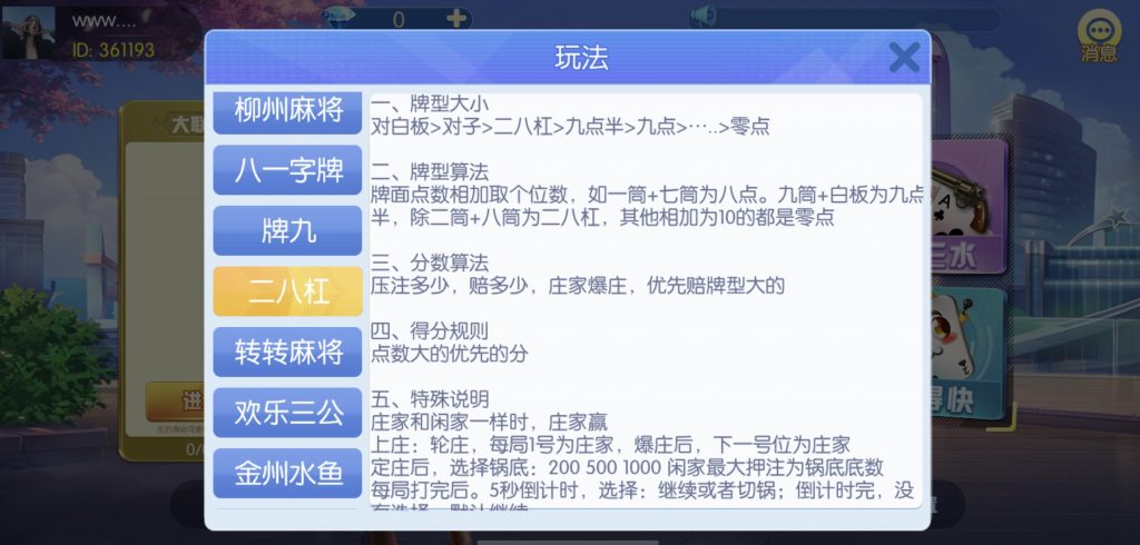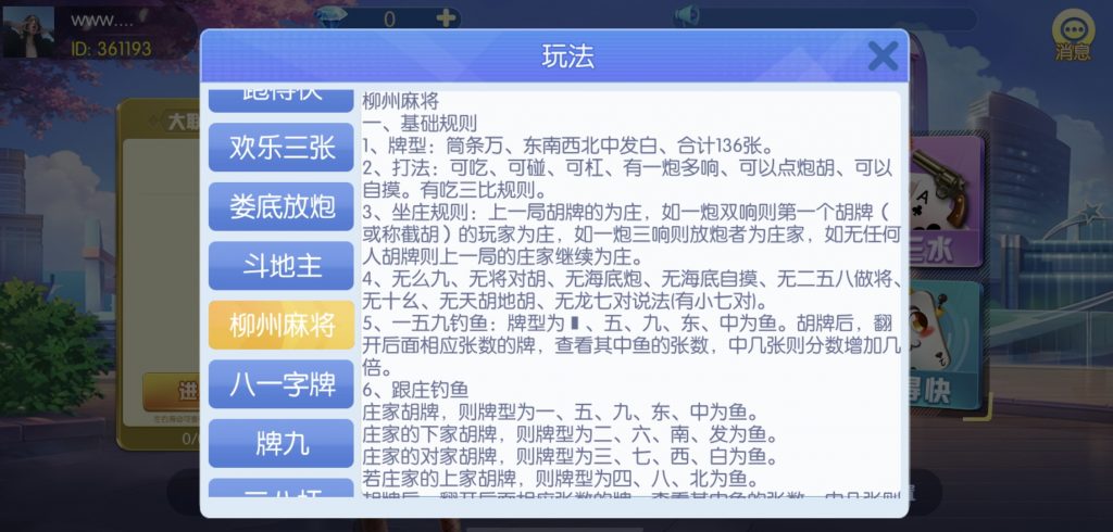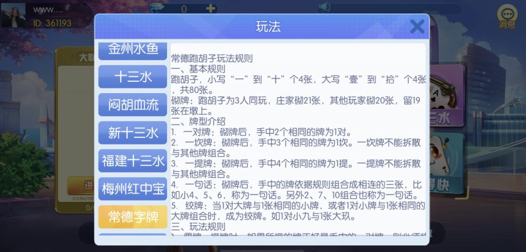 游戏:汉寿跑胡子、快乐牛牛、红中麻将、跑得快、柳州麻将、常德跑胡子、娄底放炮罚、邵阳剥皮、牌九、推锅牌九、八一字牌、快乐三公、新十三水、新余510k、新余麻将、柳州字牌、翻三皮、碰碰胡、泰和过炸、96游戏、老牌、跑胡子、长沙麻将、新化打炸、戳虾子麻将、荆楚花牌、快乐金花、无限斗公牛、沅江鬼胡子、沅江千分、沅江麻将、梅州红中宝