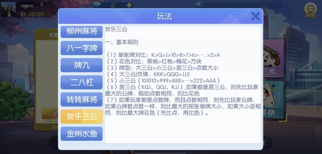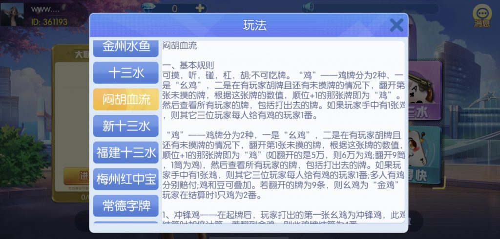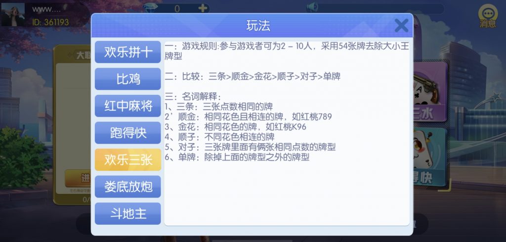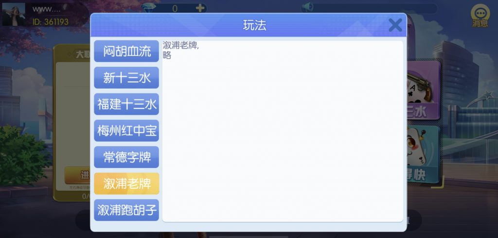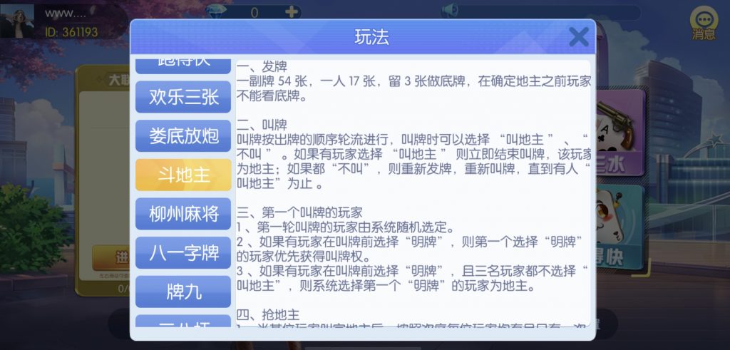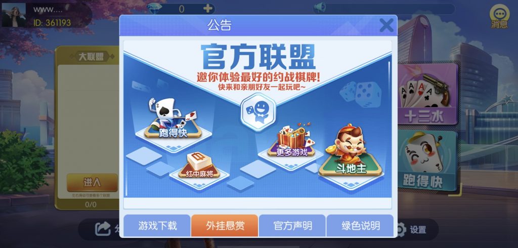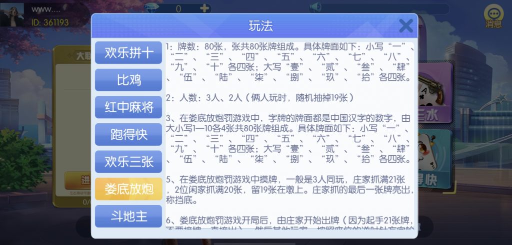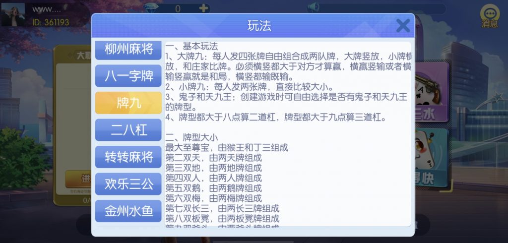 游戏:汉寿跑胡子、快乐牛牛、红中麻将、跑得快、柳州麻将、常德跑胡子、娄底放炮罚、邵阳剥皮、牌九、推锅牌九、八一字牌、快乐三公、新十三水、新余510k、新余麻将、柳州字牌、翻三皮、碰碰胡、泰和过炸、96游戏、老牌、跑胡子、长沙麻将、新化打炸、戳虾子麻将、荆楚花牌、快乐金花、无限斗公牛、沅江鬼胡子、沅江千分、沅江麻将、梅州红中宝