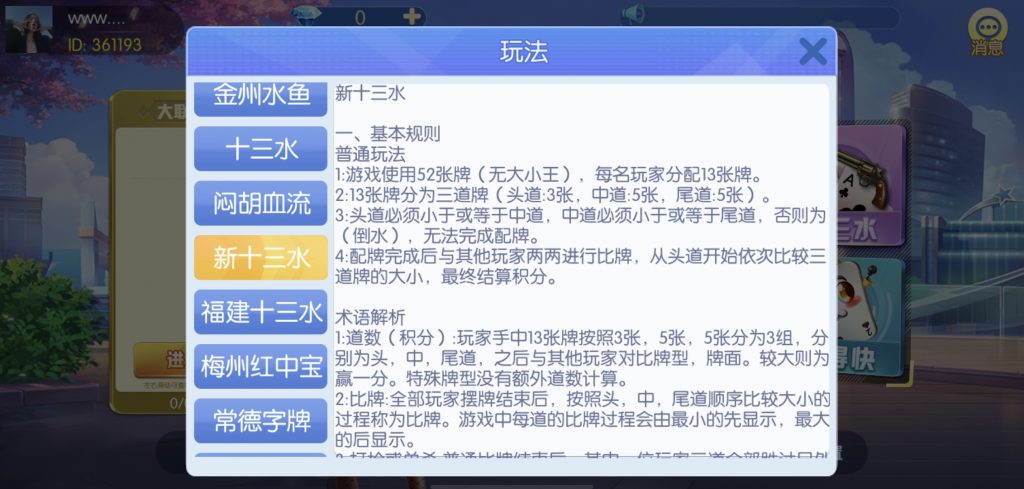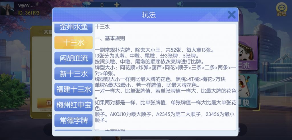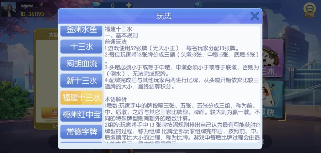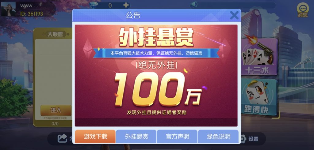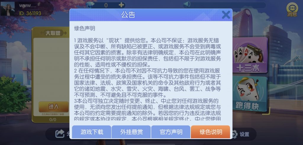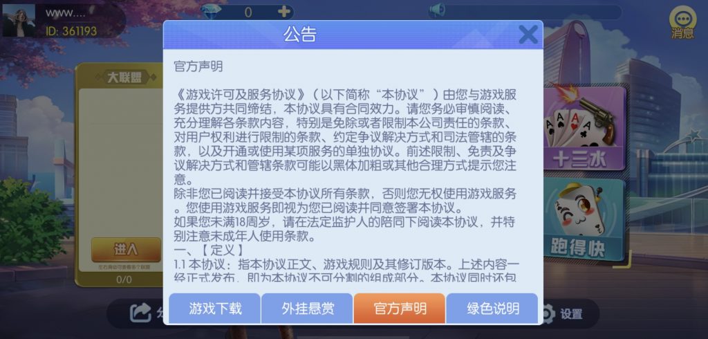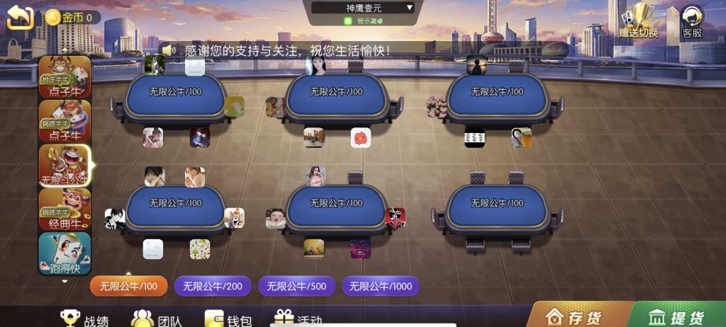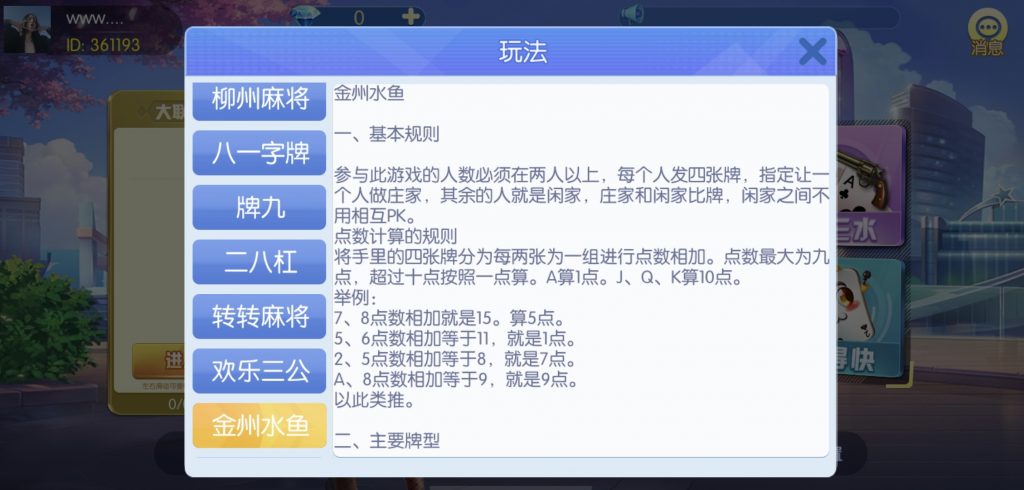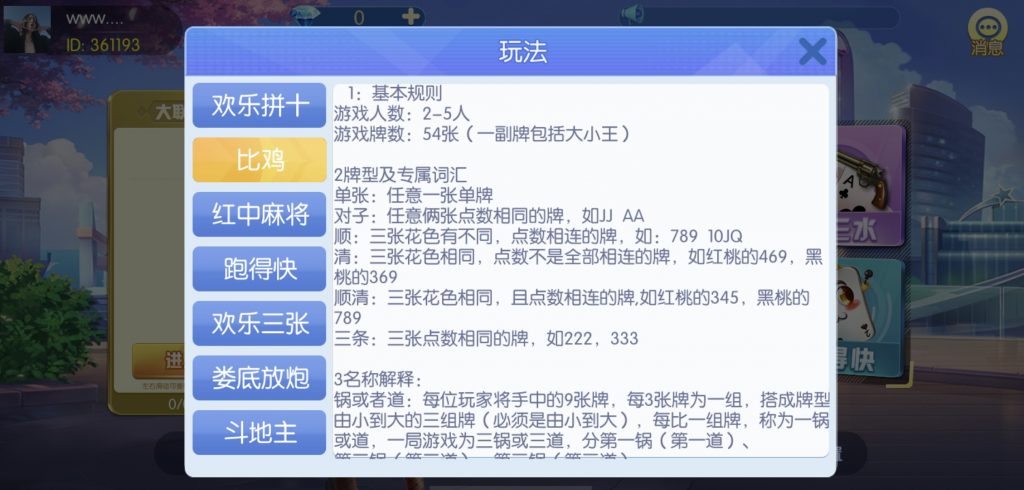 游戏:汉寿跑胡子、快乐牛牛、红中麻将、跑得快、柳州麻将、常德跑胡子、娄底放炮罚、邵阳剥皮、牌九、推锅牌九、八一字牌、快乐三公、新十三水、新余510k、新余麻将、柳州字牌、翻三皮、碰碰胡、泰和过炸、96游戏、老牌、跑胡子、长沙麻将、新化打炸、戳虾子麻将、荆楚花牌、快乐金花、无限斗公牛、沅江鬼胡子、沅江千分、沅江麻将、梅州红中宝
