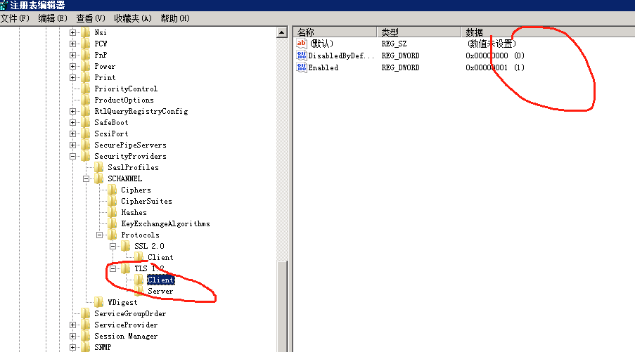 ## 启用TLS 1.2 #查询 reg query "HKEY_LOCAL_MACHINESYSTEMCurrentControlSetControlSecurityProvidersSCHANNELProtocolsTLS 1.2Client" #添加client reg add "HKEY_LOCAL_MACHINESYSTEMCurrentControlSetControlSecurityProvidersSCHANNELProtocolsTLS 1.2Client" /v "Enabled" /t REG_DWORD /d "1" /f reg add "HKEY_LOCAL_MACHINESYSTEMCurrentControlSetControlSecurityProvidersSCHANNELProtocolsTLS 1.2Client" /v "DisabledByDefault" /t REG_DWORD /d "0" /f #添加Server reg add "HKEY_LOCAL_MACHINESYSTEMCurrentControlSetControlSecurityProvidersSCHANNELProtocolsTLS 1.2Server" /v "Enabled" /t REG_DWORD /d "1" /f reg add "HKEY_LOCAL_MACHINESYSTEMCurrentControlSetControlSecurityProvidersSCHANNELProtocolsTLS 1.2Server" /v "DisabledByDefault" /t REG_DWORD /d "0" /f