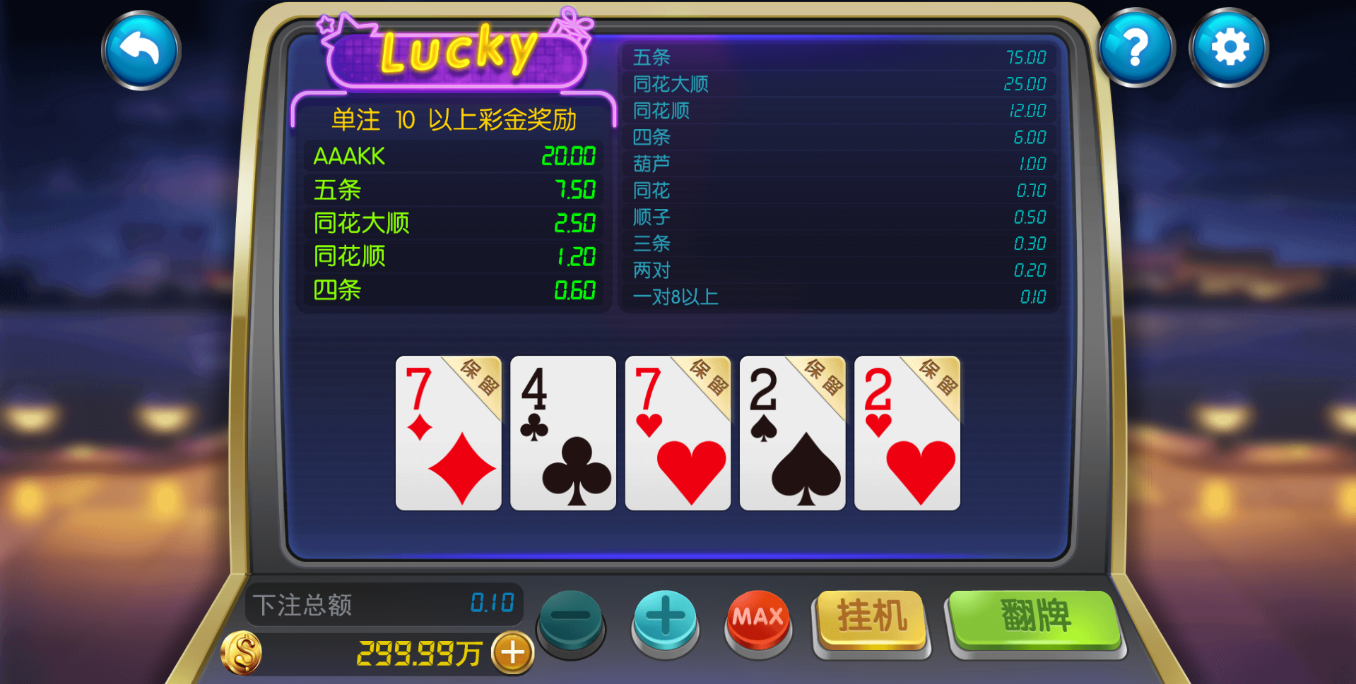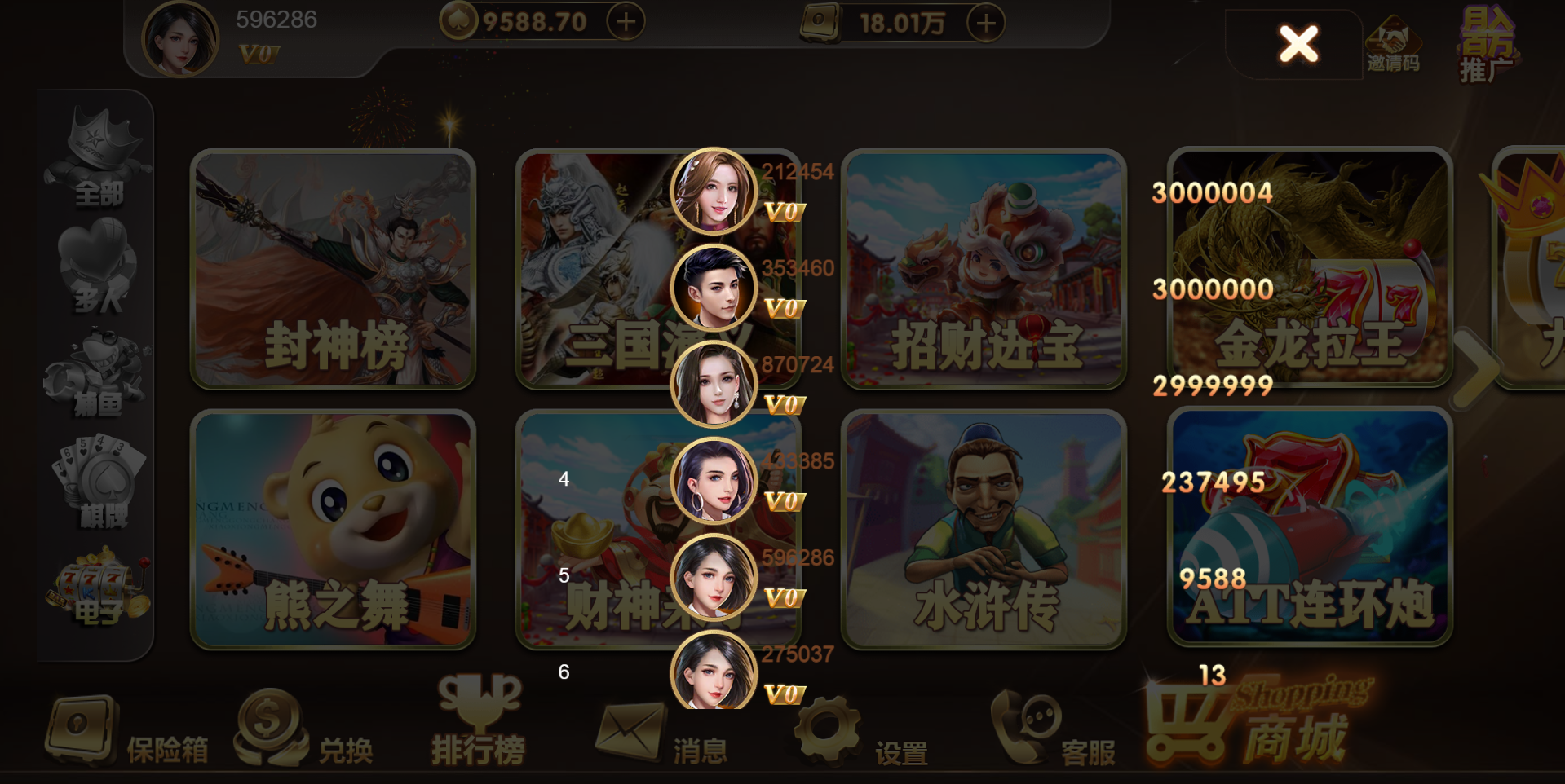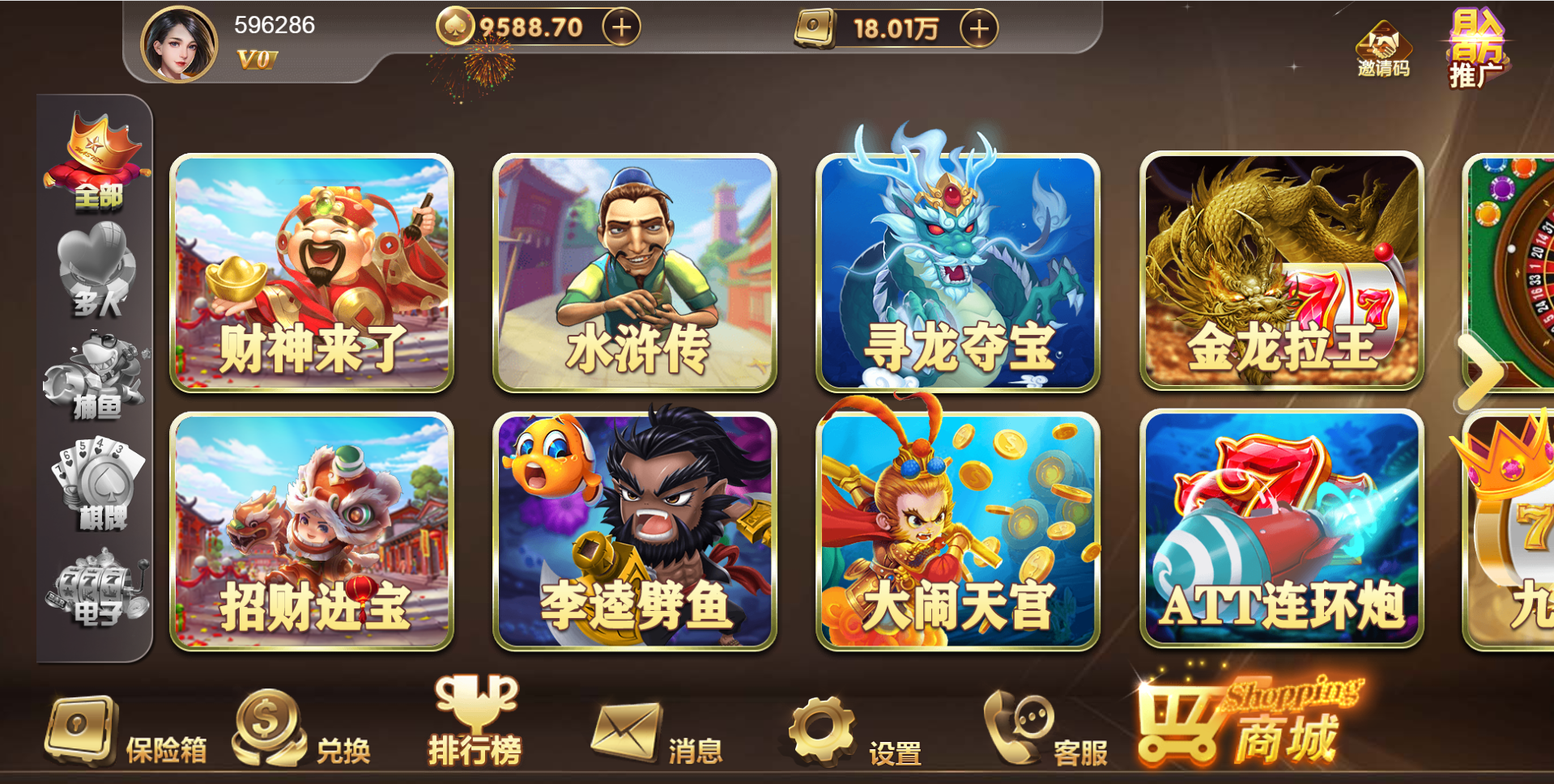 三国演义 财神来了 招财进宝 水浒传 李逵劈鱼 寻龙夺宝 大闹天宫 金龙拉王 ATT连环炮 押宝 九线拉王 德州牛仔 红黑大战 龙虎斗 二人牛牛