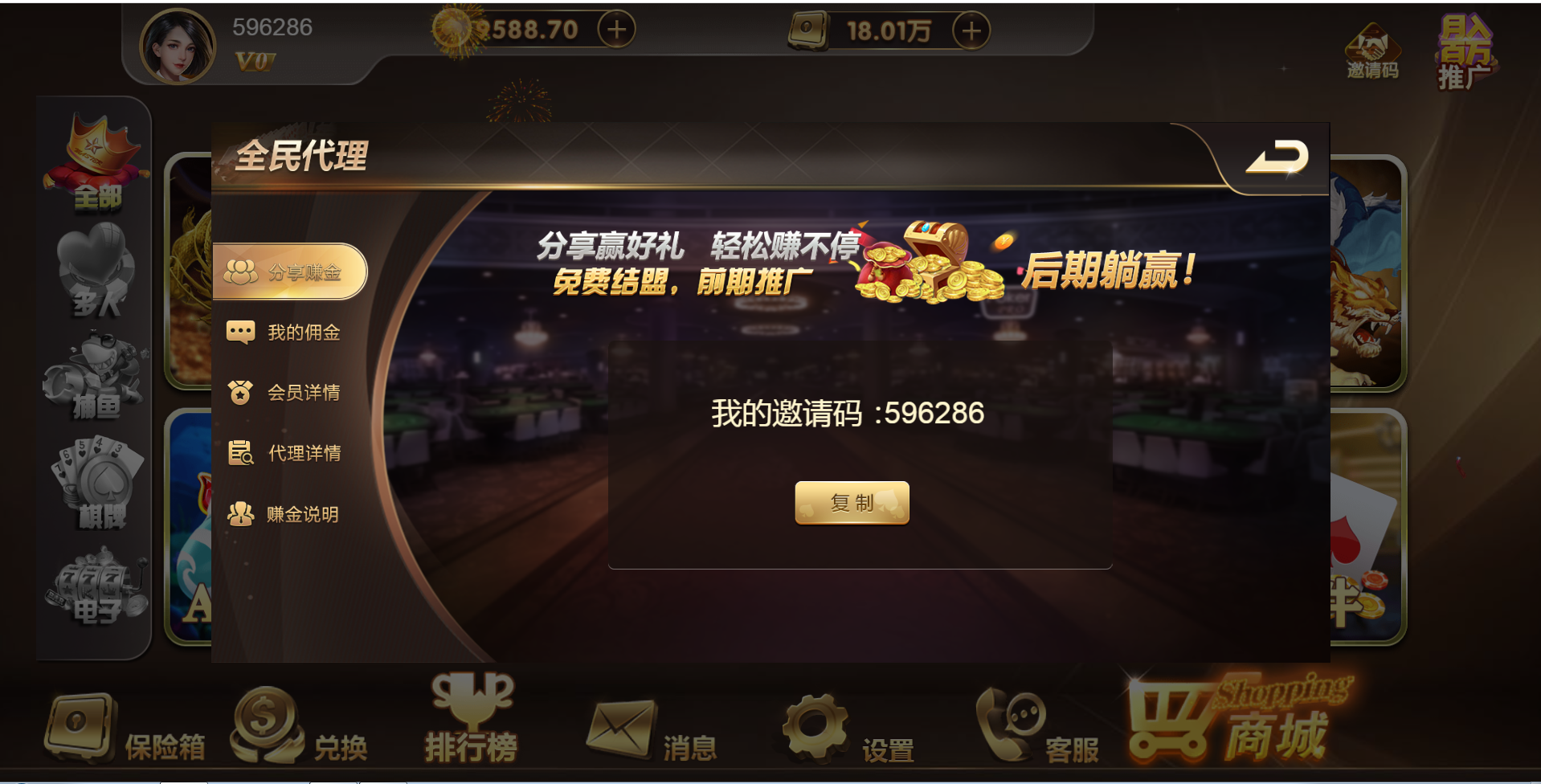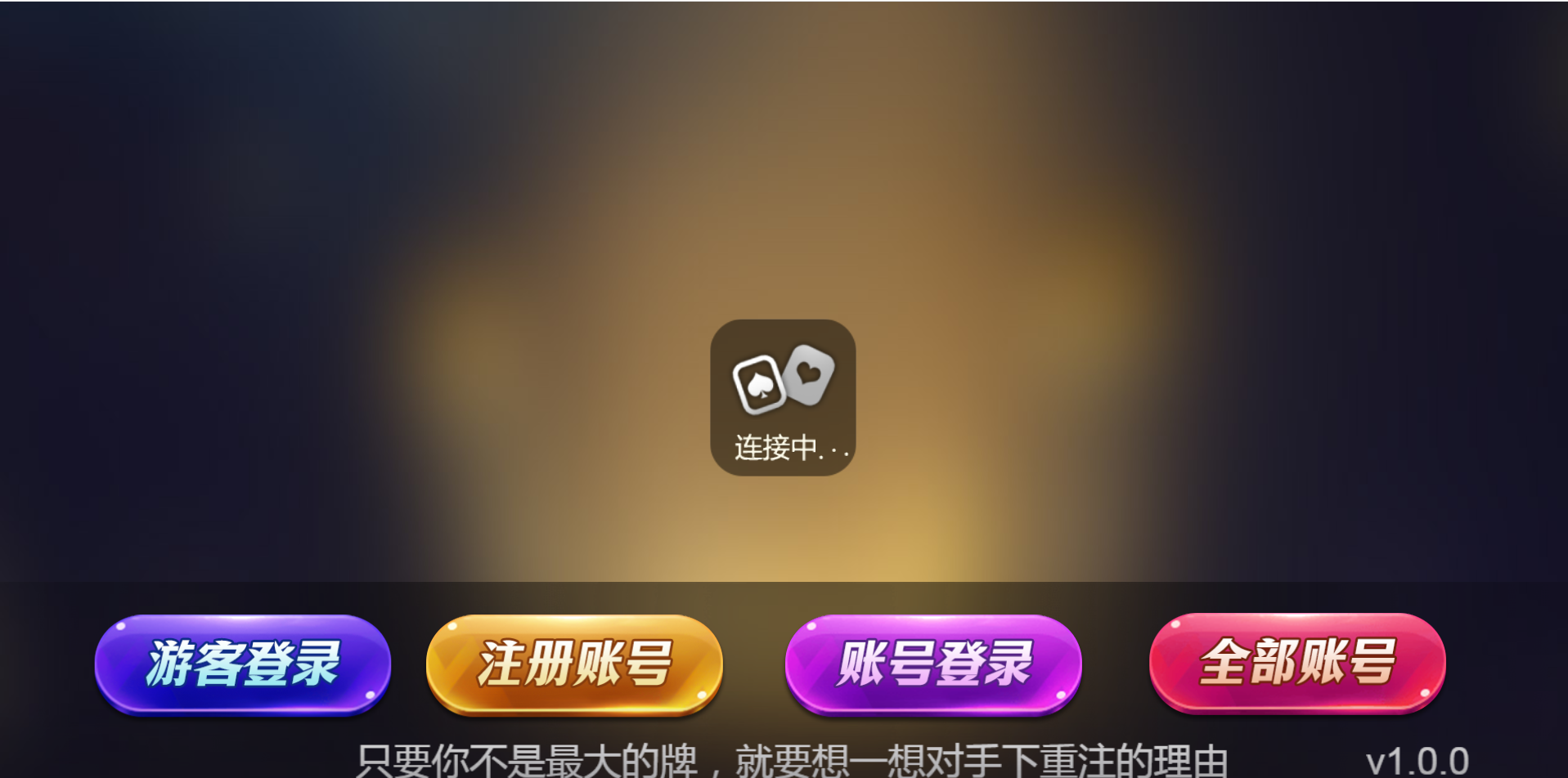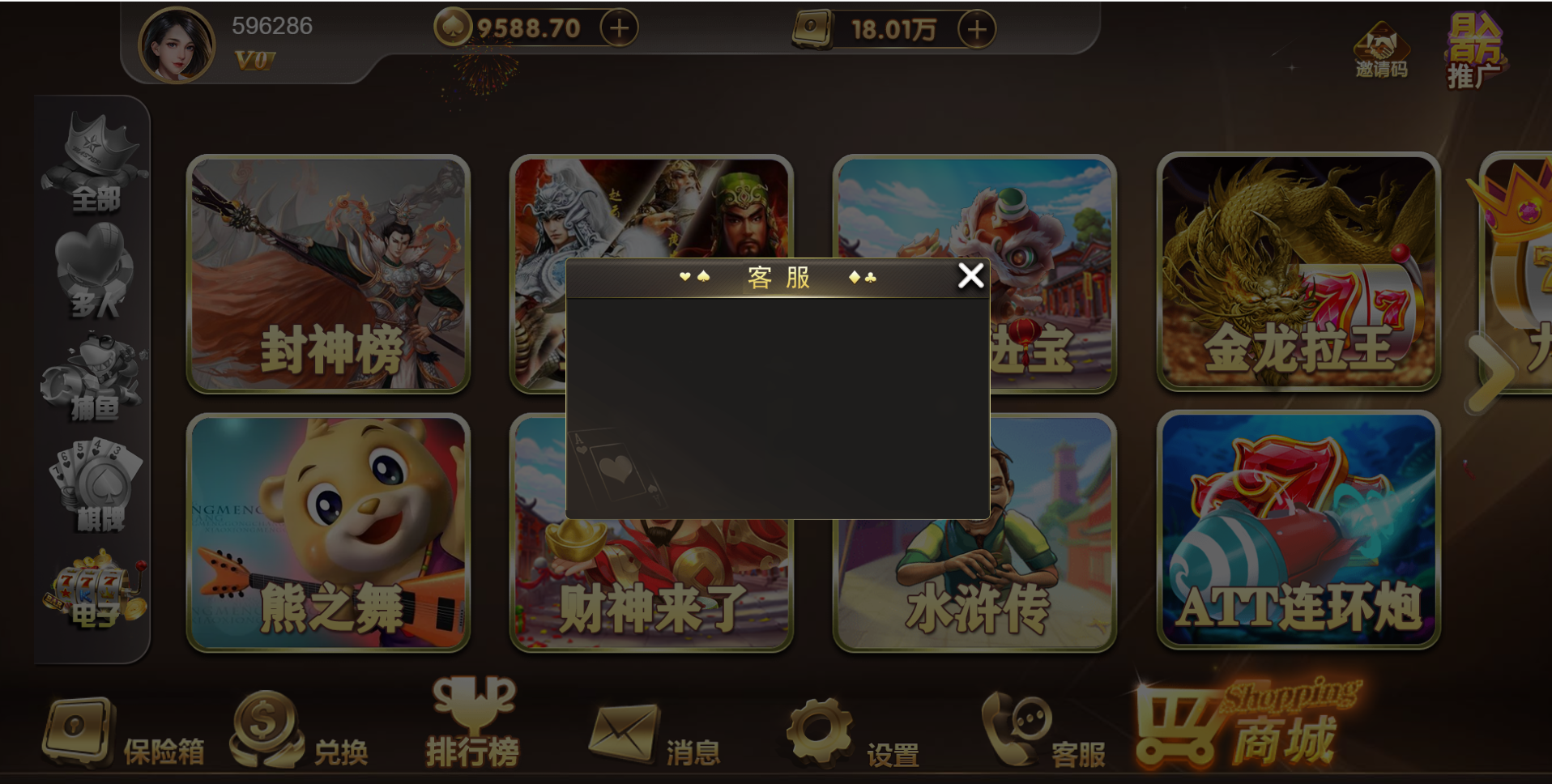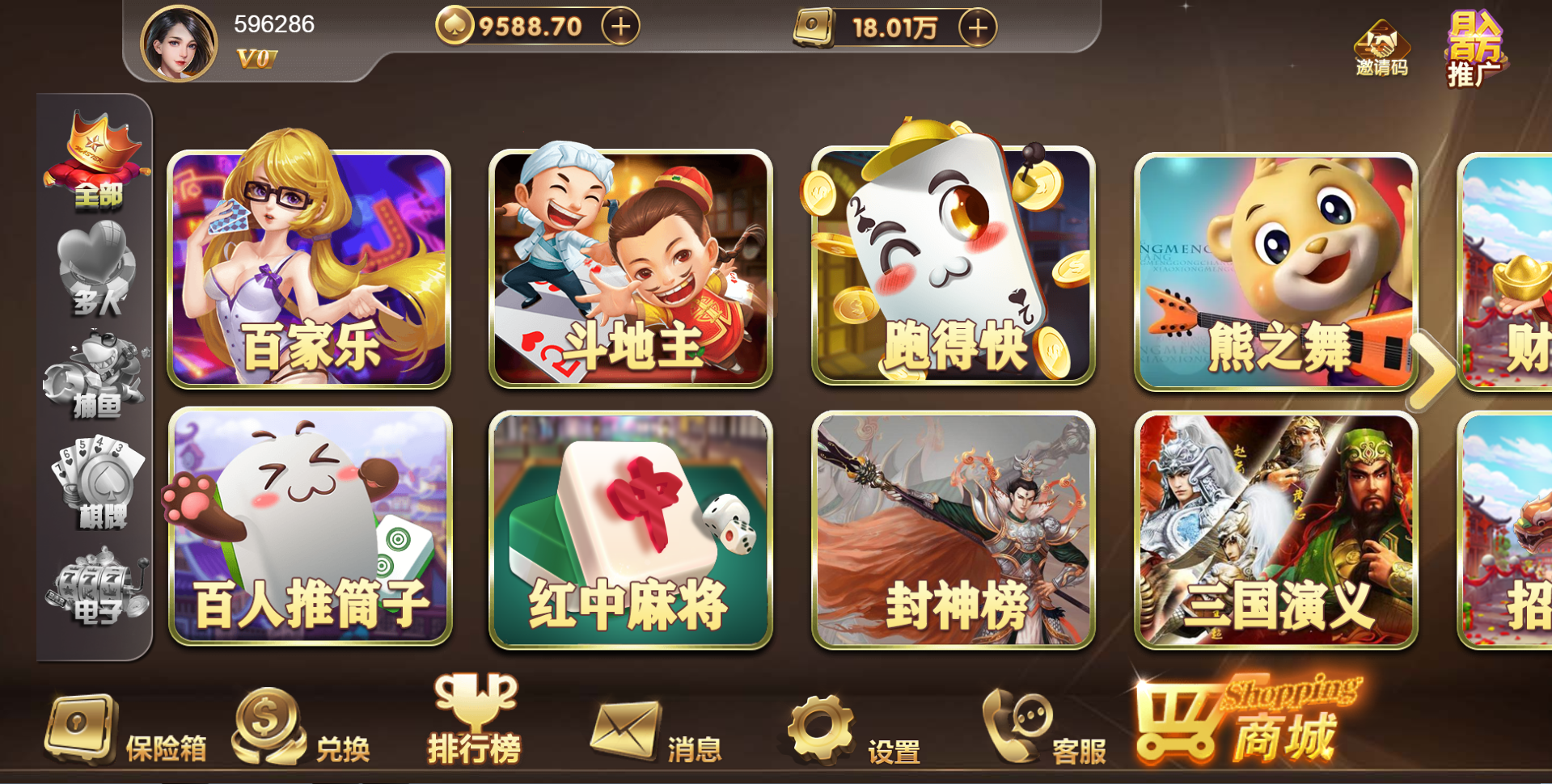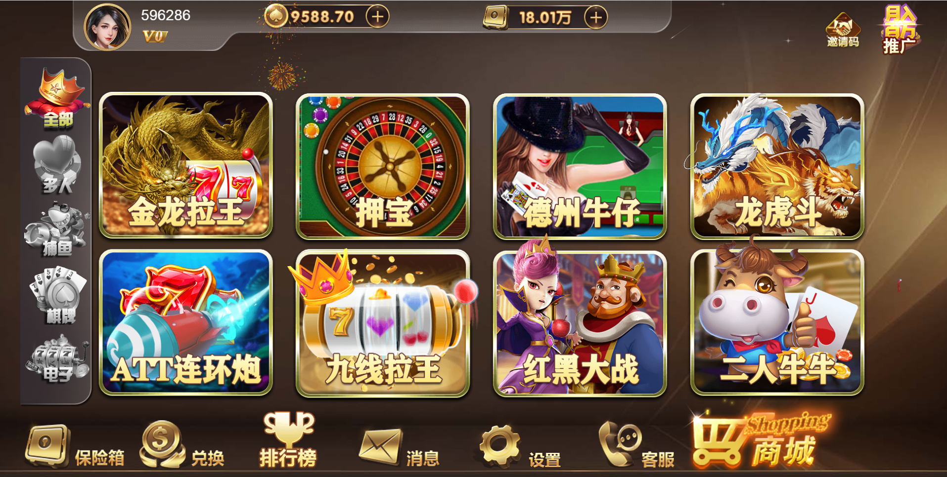 游戏种类:德州扑克 扎金花 十三水 抢庄牛牛 百人扎金花 奔驰宝马 百人牛牛 骰宝  百家乐 百人推筒子 斗地主 红中麻将 跑得快 封神榜 熊之舞