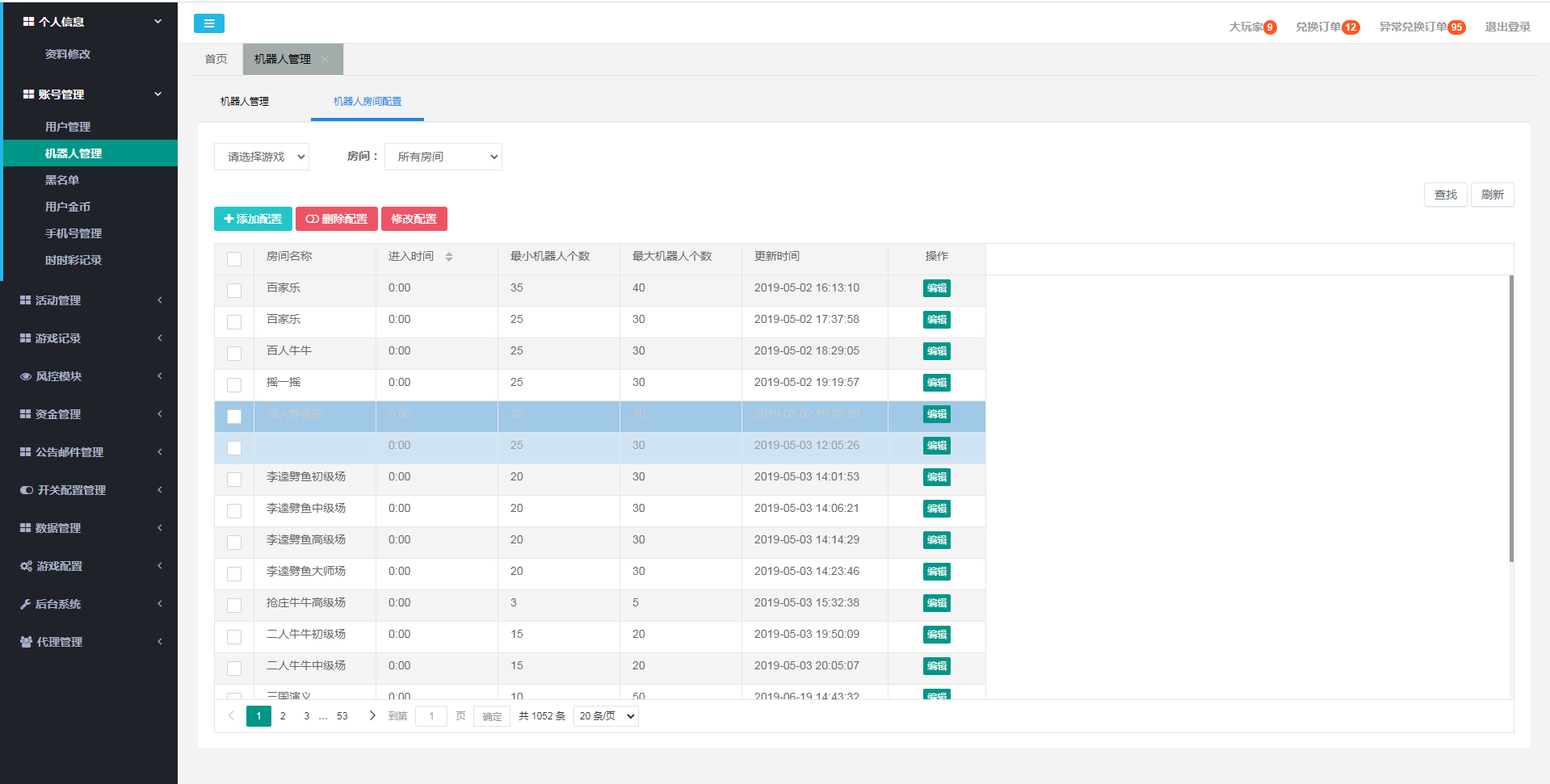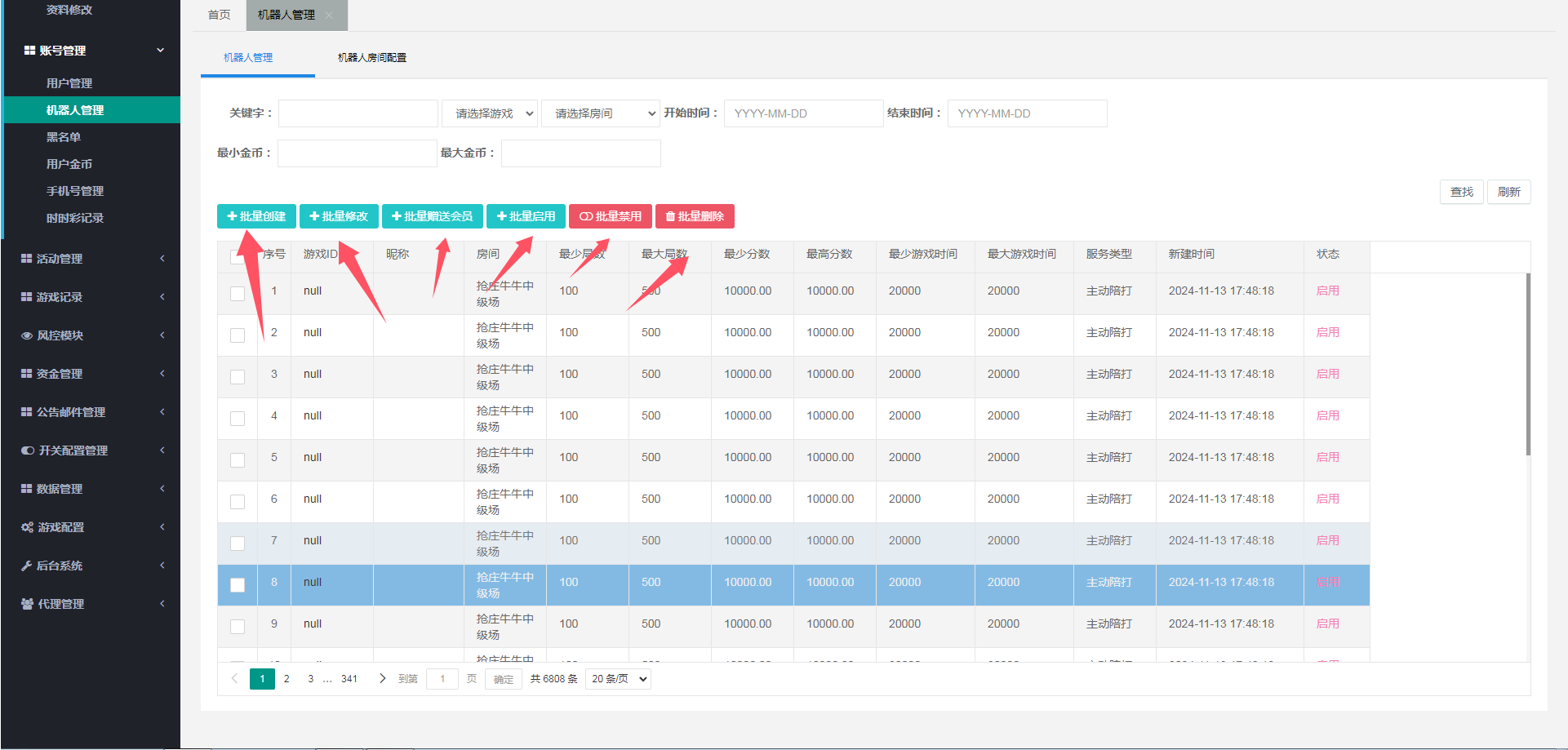 可以批量添加机器人进入指定房间和设置机器人陪玩局数和时长,能够设置机器人 相互模拟 主动陪玩 被动陪玩 等,可以设置游戏名字  可以自由开关增删游戏房间等
